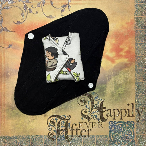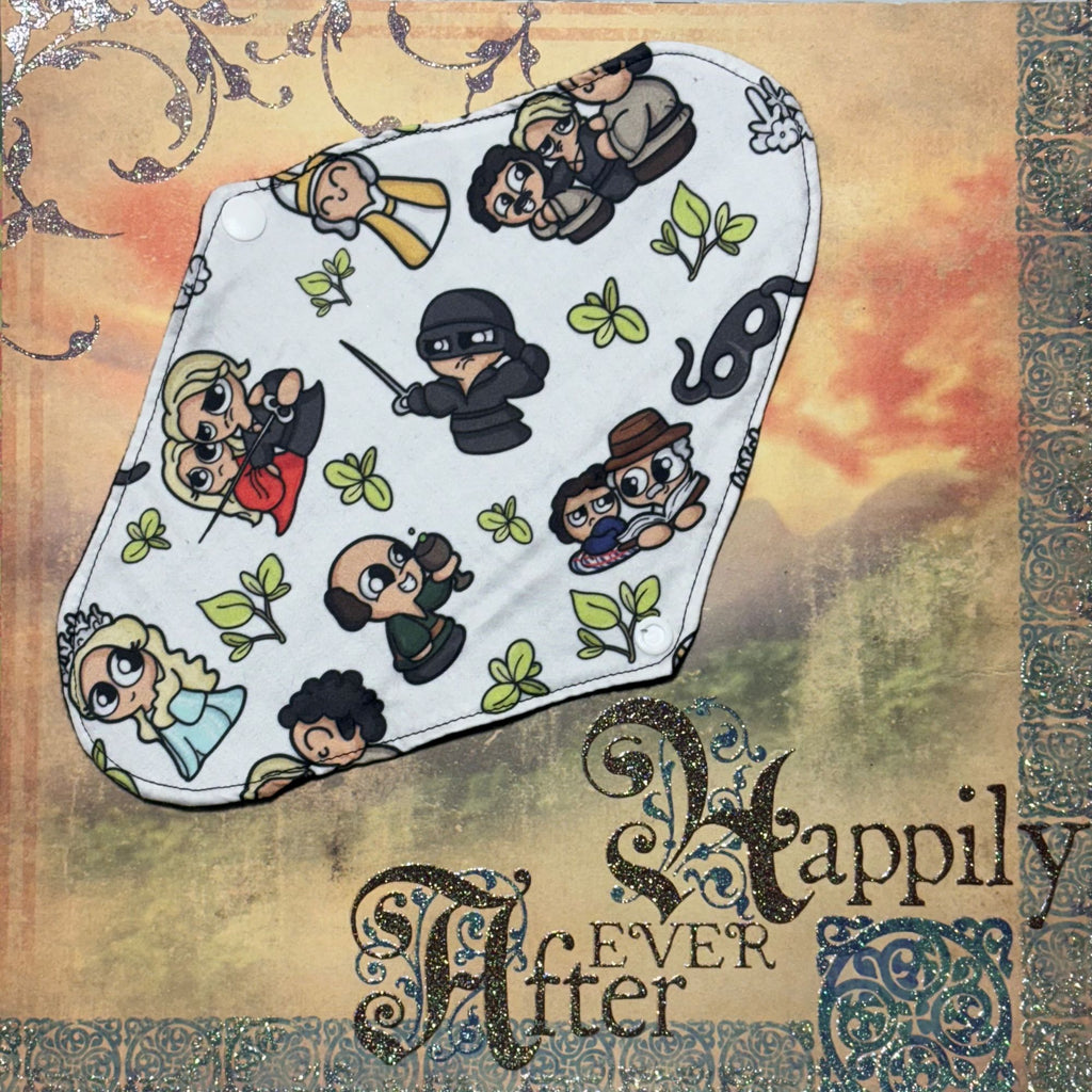 This listing is for a menstrual liner in our Princess Bride print. This is one of our artist-supporting prints, featuring fun and cute chibis of the cast of Princess Bride. There's Buttercup and Wesley of course, but also Inigo, Fezzik, the Sicilian and even our adorable narrating duo.